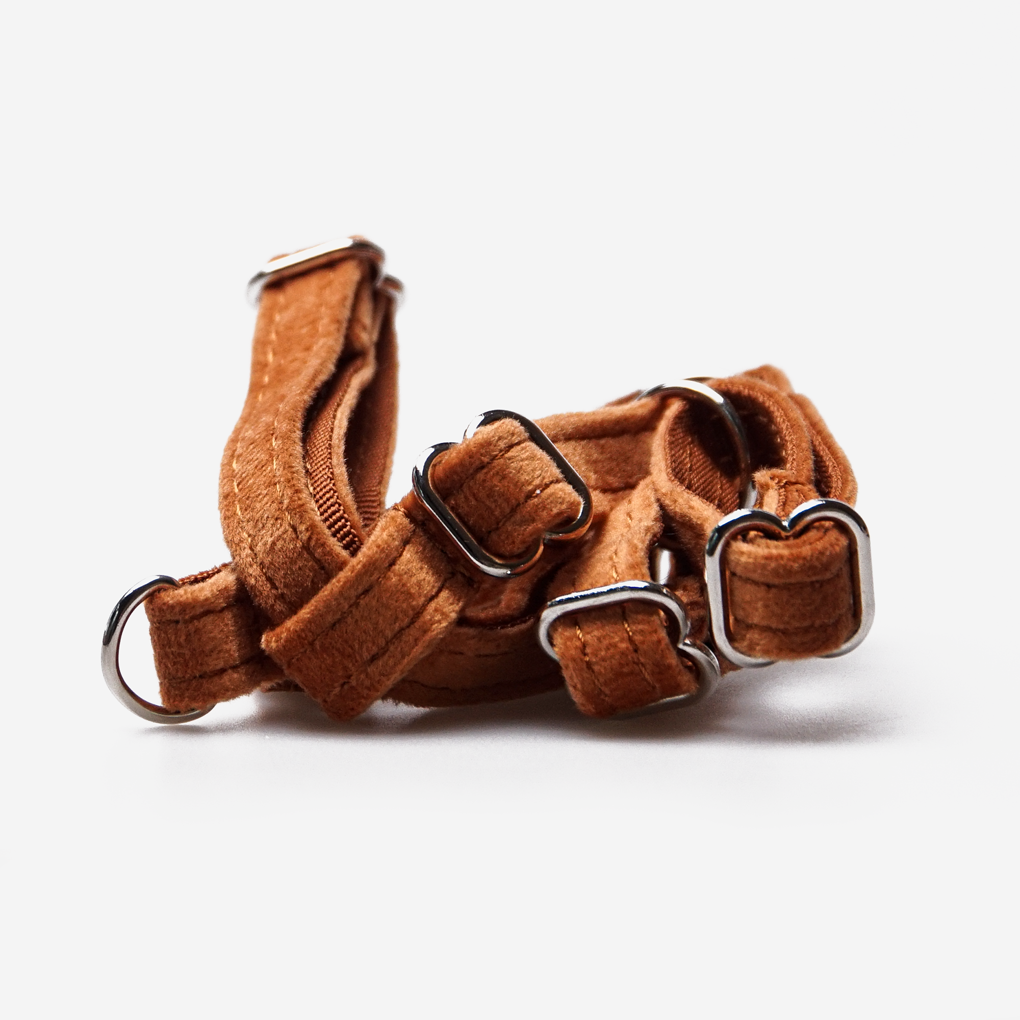 Hundsele Petit Soft Caramel är en modell i en kollektion av handgjorda halsband, koppel, selar och flugor – särskilt utvecklade för de minsta hundarna. Med tunna band och lätta spännen är den ett perfekt val för mindre hundraser och valpar som behöver en nätt och bekväm sele.