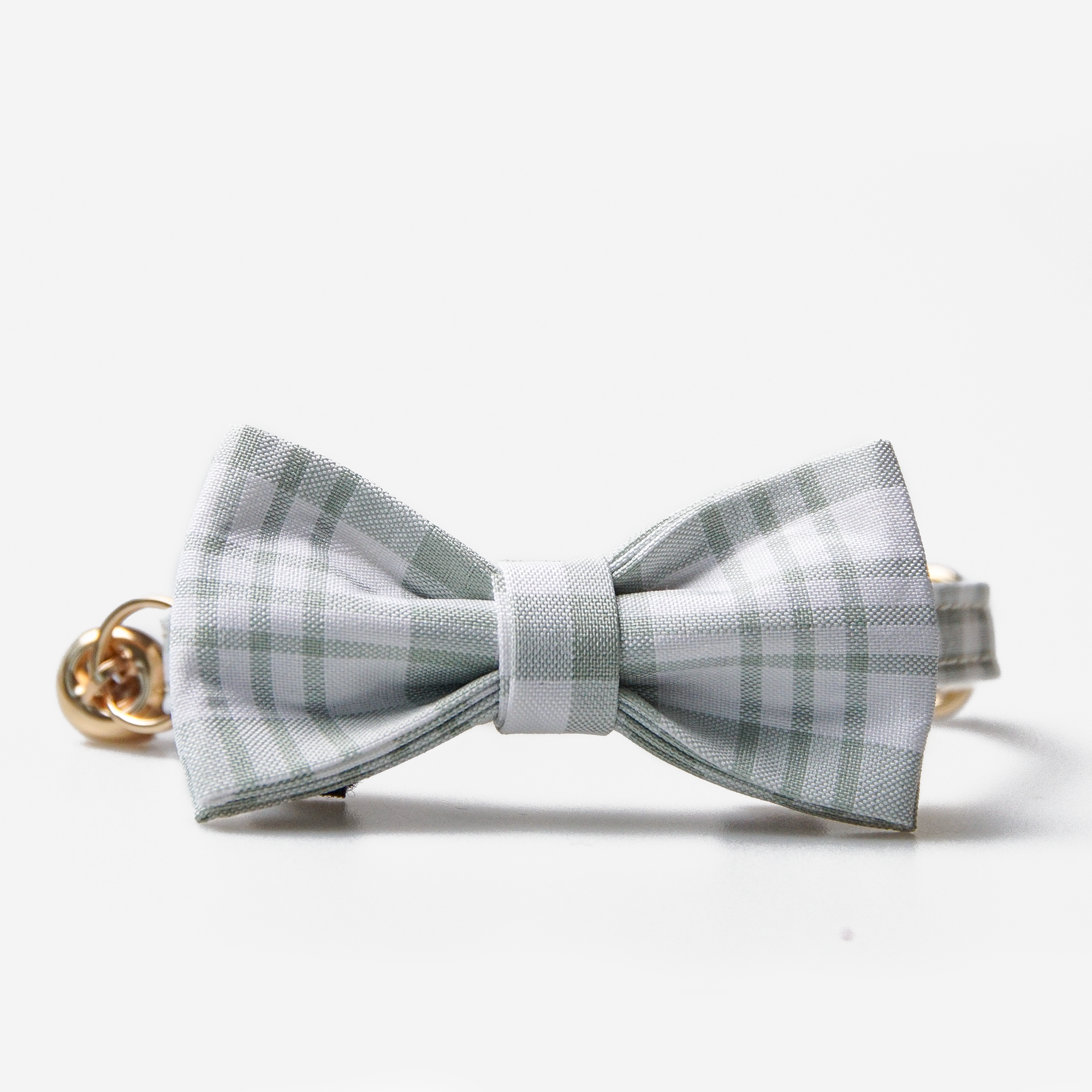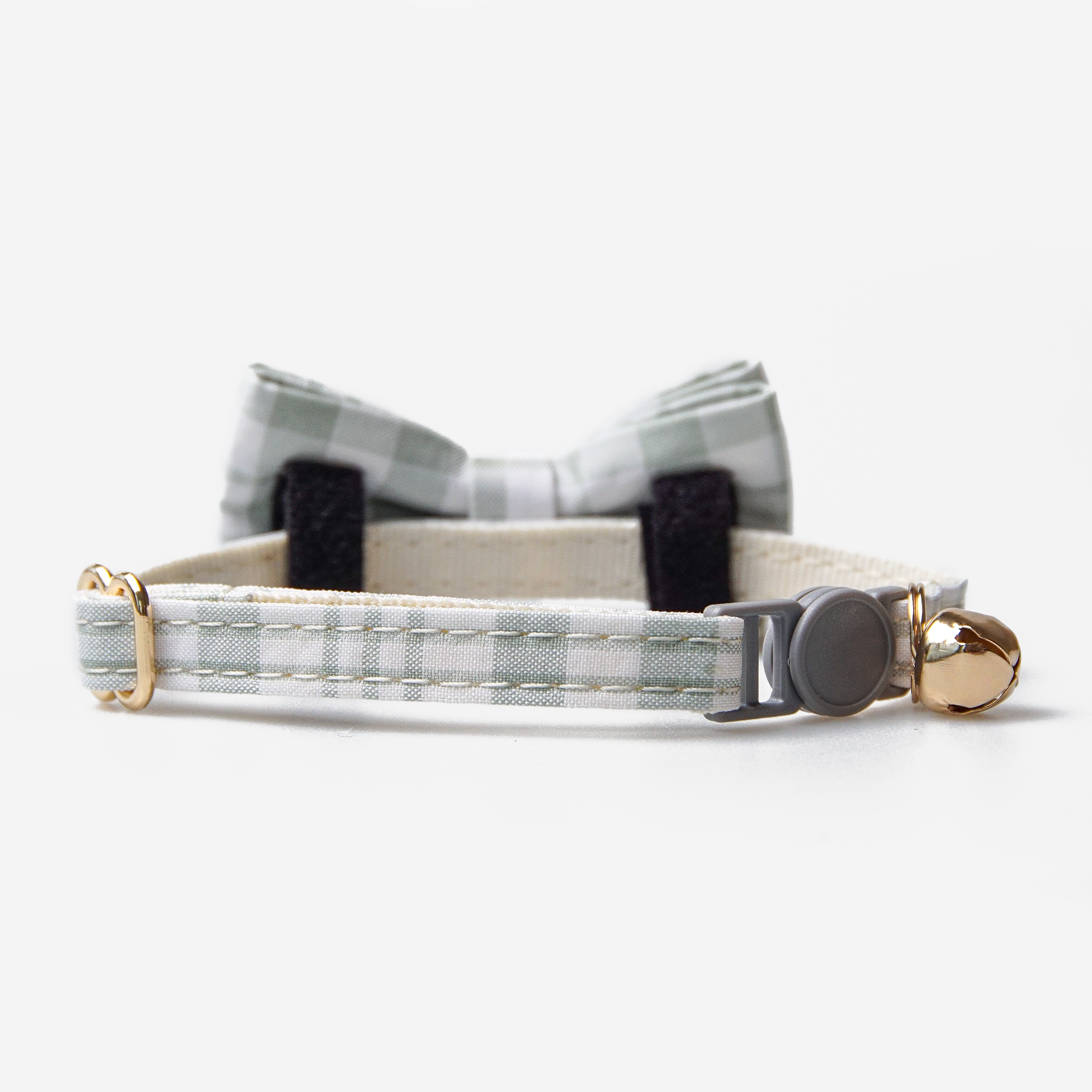 Katthalsband Willow Green med fluga är ett stilrent katthalsband i mjukt bomullstyg i en dämpad grön nyans. Det diskreta rutmönstret i kombination med den matchande flugan ger ett klassiskt och harmoniskt uttryck – perfekt för katter som passar i en tidlös och minimalistisk stil.