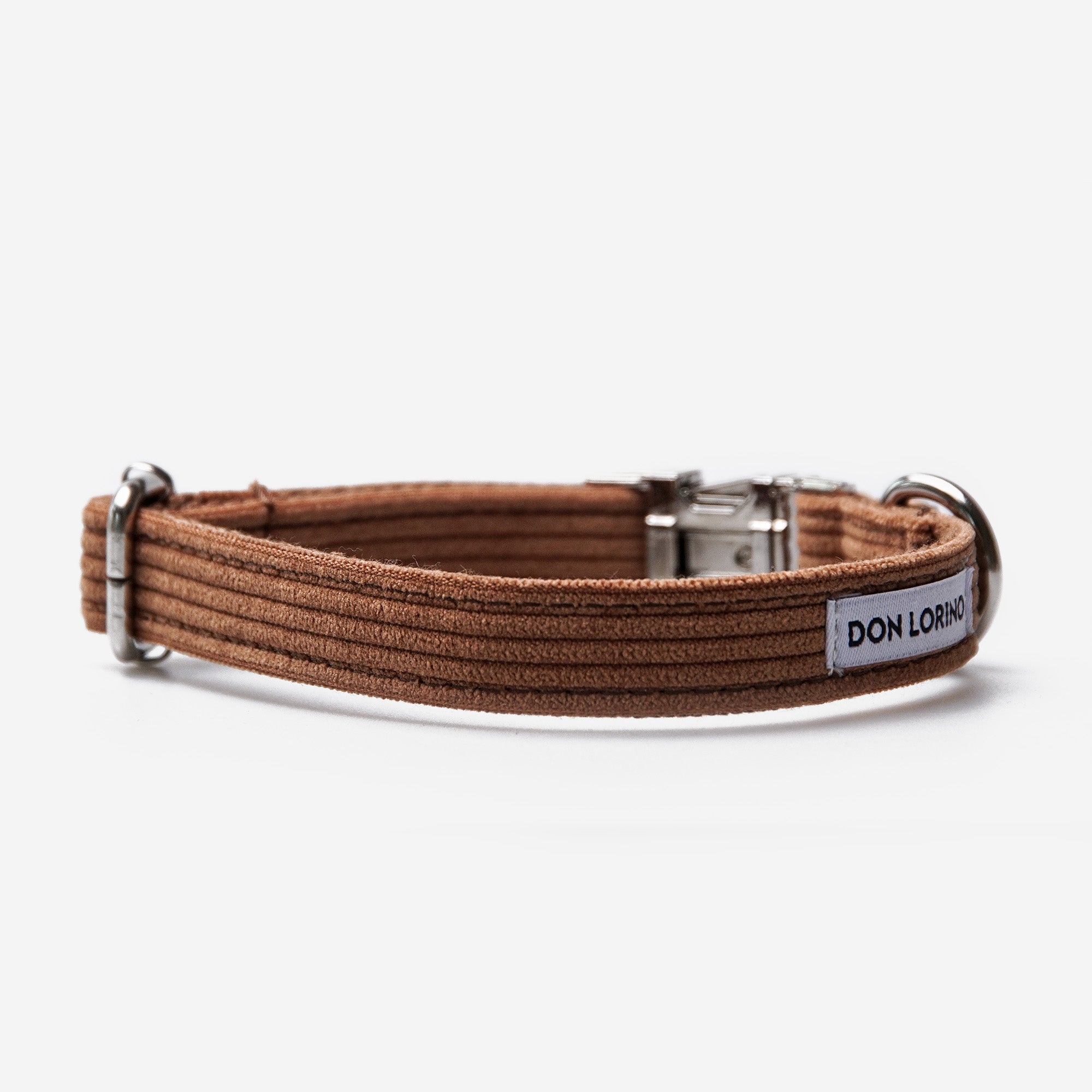 Hundhalsband Click Pop Mocha är ett handgjort halsband i en serie av matchande koppel, selar och flugor. Det är tillverkat i ett unikt lättviktsmaterial med utsida av mjuk manchester och insida av vaxad bomull i Don Lorinos signaturfärger. Kombinationen av material ger ett slitstarkt, allergivänligt, lätt och antibakteriellt halsband som är skönt att bära – även för mindre hundar.