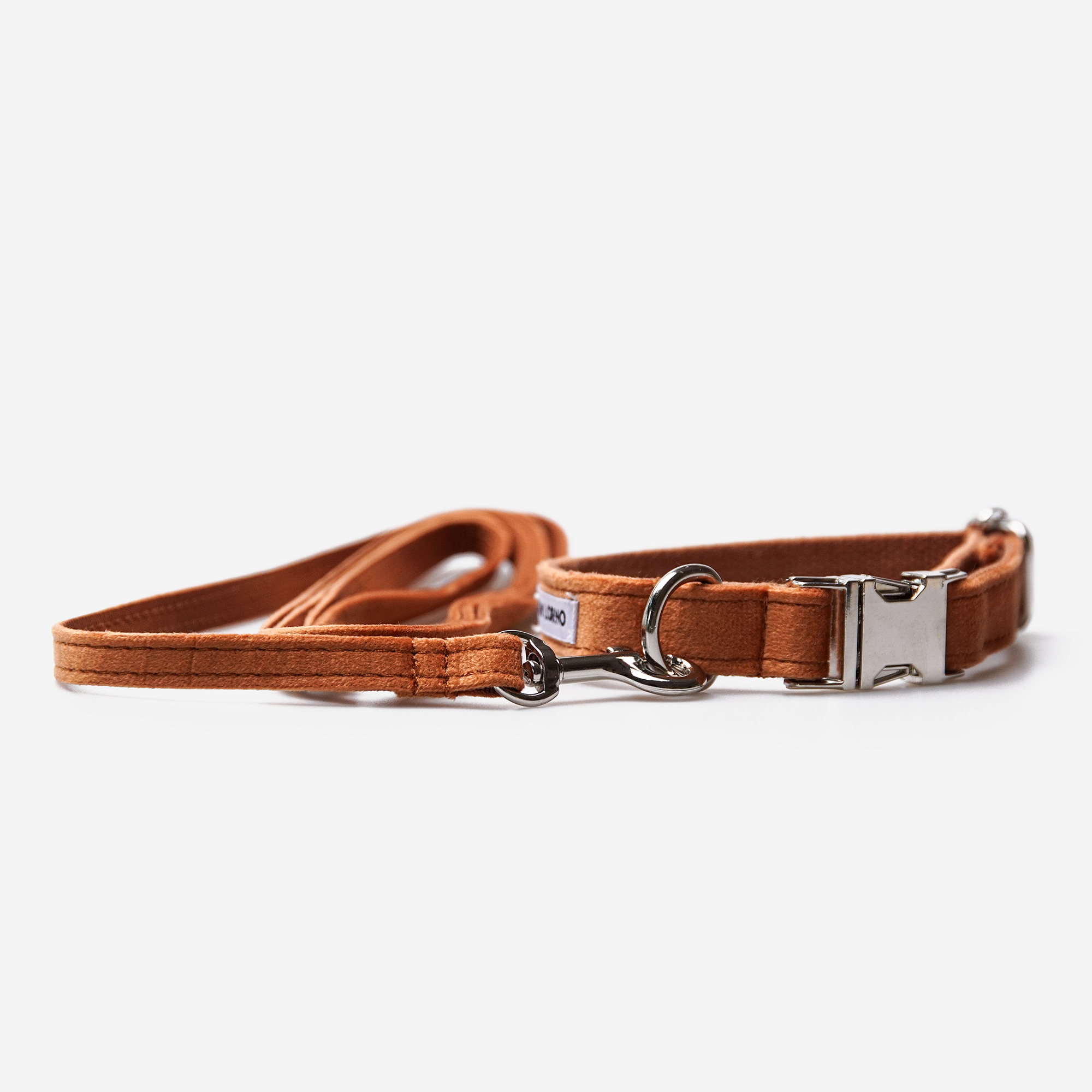 Hundhalsband Click Soft Caramel är ett handgjort halsband i en serie av matchande koppel, selar och flugor. Det är tillverkat i ett unikt lättviktsmaterial med utsida av mjuk sammet och insida av vaxad bomull i Don Lorinos signaturfärger. Kombinationen av material ger ett halsband som är slitstarkt, allergivänligt, lätt och antibakteriellt – och samtidigt bekvämt att bära även för mindre hundar.