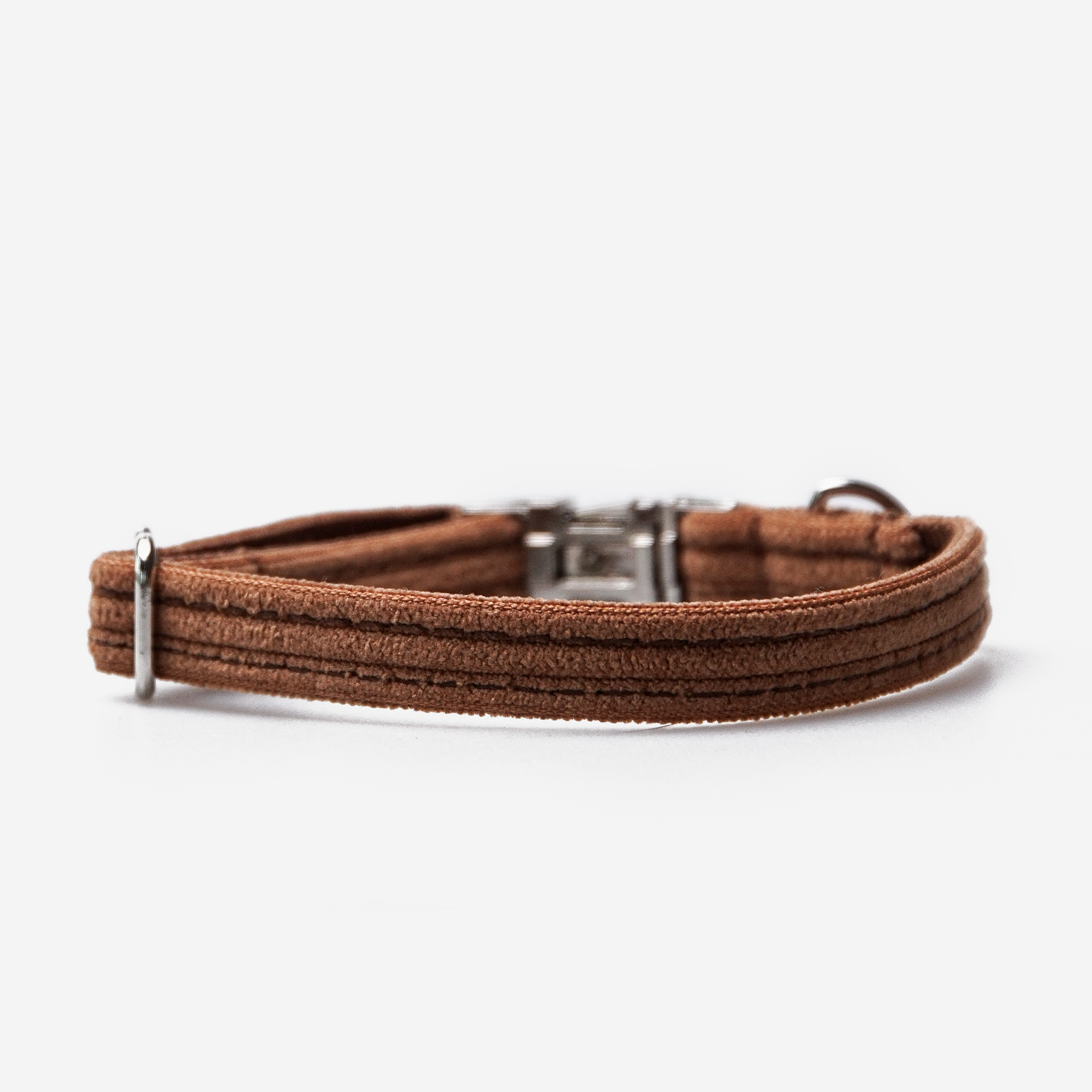 Halsbandet är tillverkat i en kombination av mjuk manchester på utsidan och en slitstark nylonväv på insidan, vilket gör det både skonsamt, allergivänligt, antibakteriellt och hållbart över tid. Det diskreta snabbknäppet är tillverkat i zink med ihålig konstruktion för att minimera vikt utan att tumma på säkerhet. Det mässingsfärgade metallspännet ger ett stilrent uttryck och gör halsbandet lätt att justera.