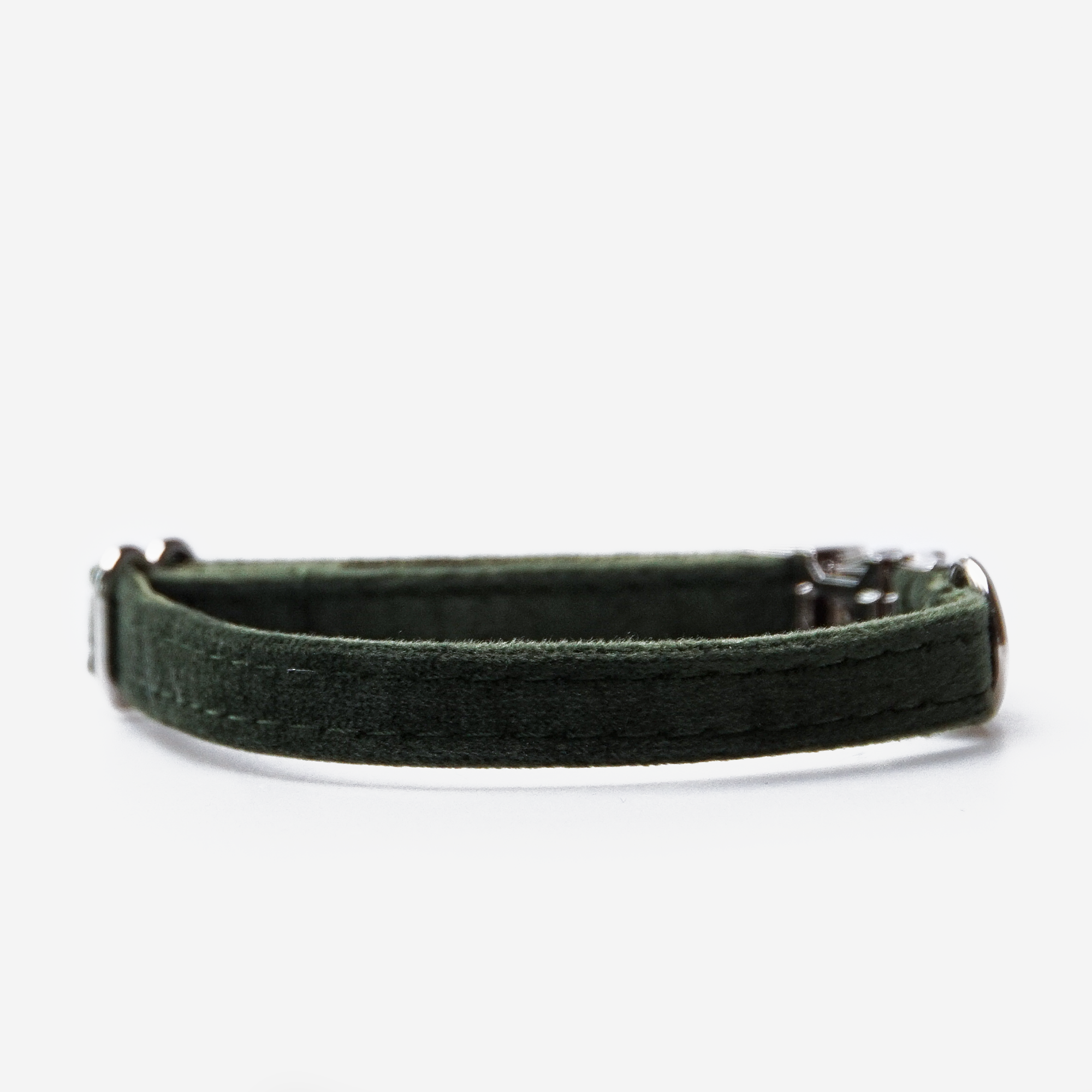 Halsbandet är tillverkat i en kombination av mjuk sammet på utsidan och slitstark nylonväv på insidan, vilket gör det både skonsamt, allergivänligt, antibakteriellt och hållbart över tid. Det diskreta snabbknäppet i zink har en ihålig konstruktion som minimerar vikten utan att kompromissa med säkerheten. Det mässingsfärgade metallspännet ger ett klassiskt och stilrent uttryck samtidigt som det gör storleken enkel att justera.